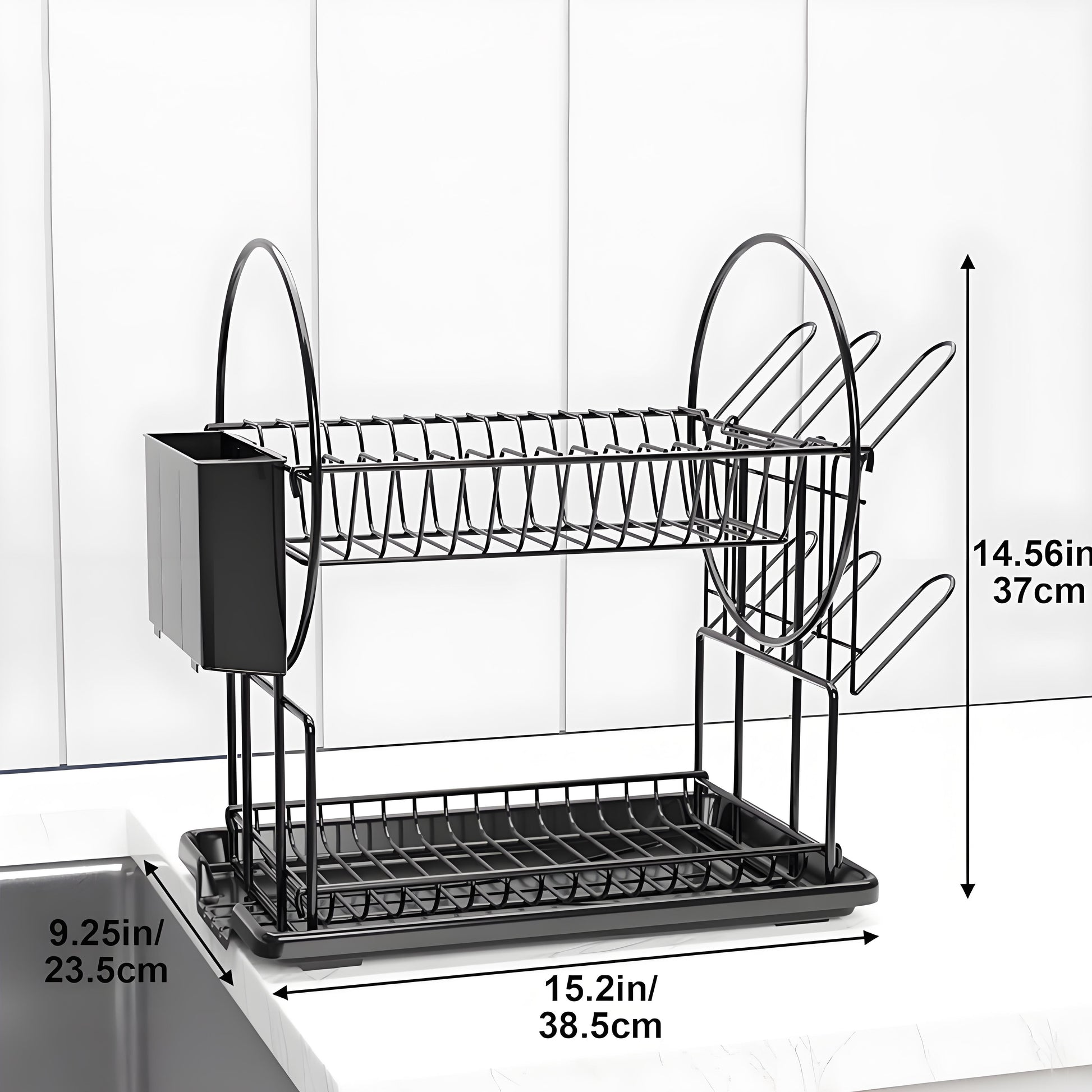 KRKZ 2-Tier Carbon Steel Dish Rack - Heavy-duty organizer with utensil/chopstick holders, fits plates/bowls/cups, rust-resistant (Black 15.2"x9.3"x14.6")