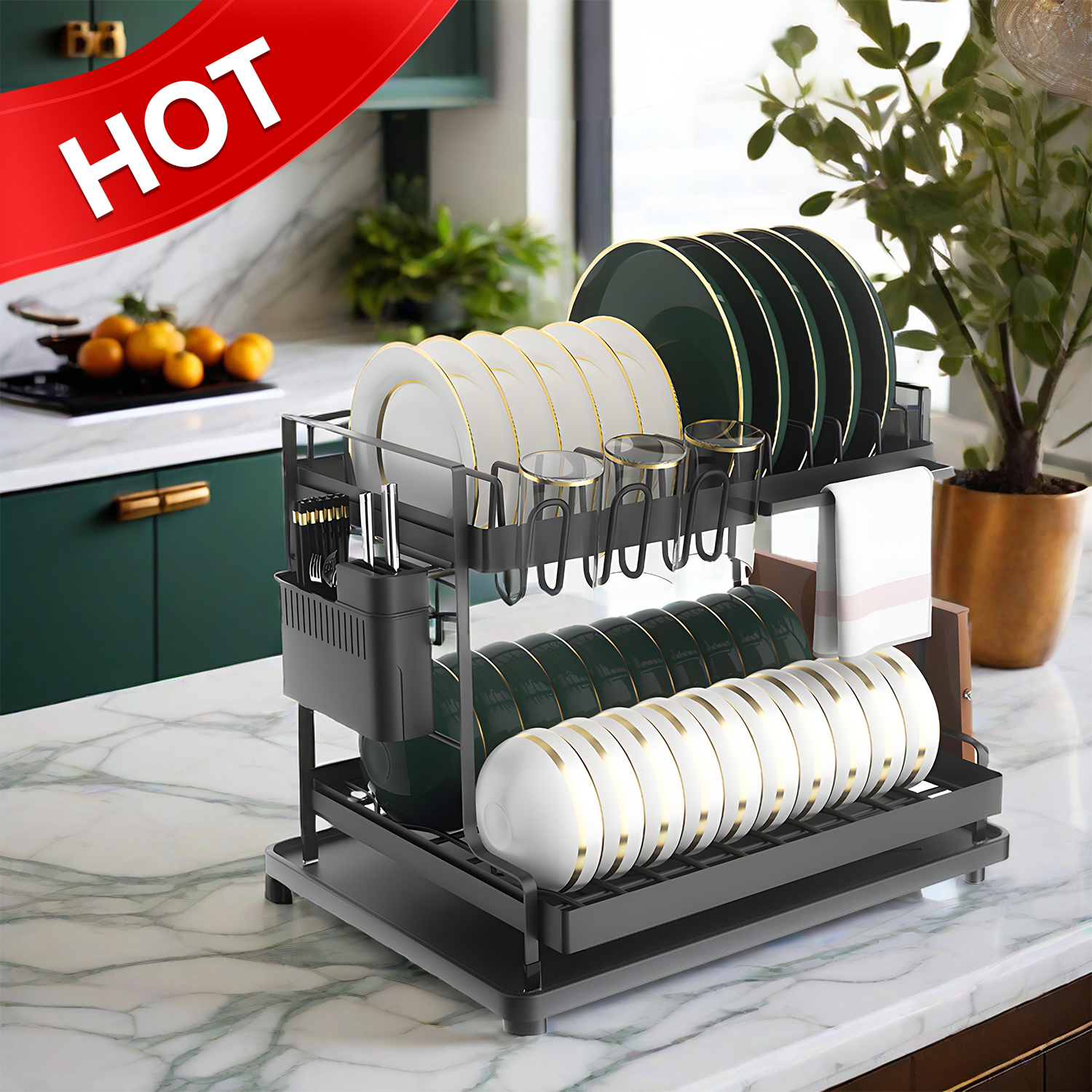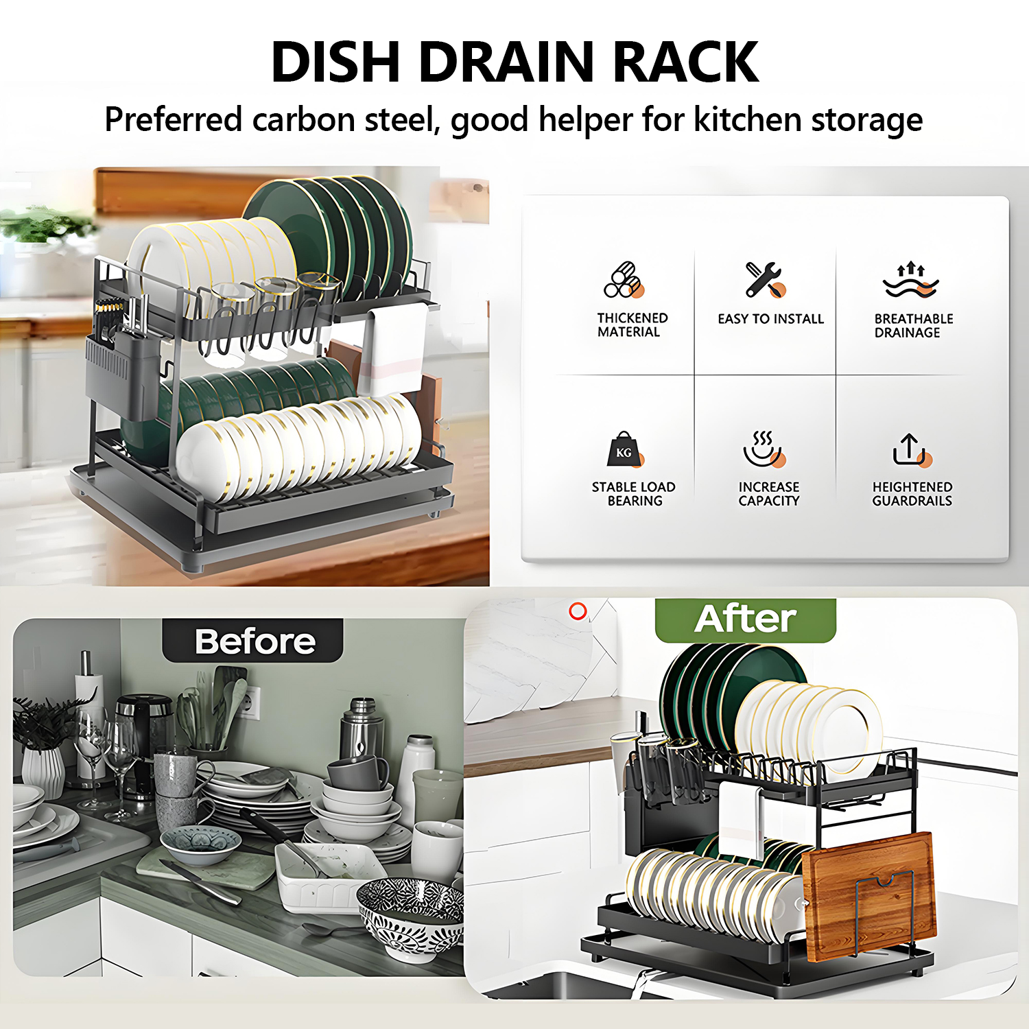 - 【Commercial-Grade Construction】 Built with 1.2mm thick powder-coated carbon steel, this rack withstands daily use while resisting rust. The reinforced frame supports 22lbs - enough for full meal sets. Matte black finish hides water spots and maintains sleek aesthetics.