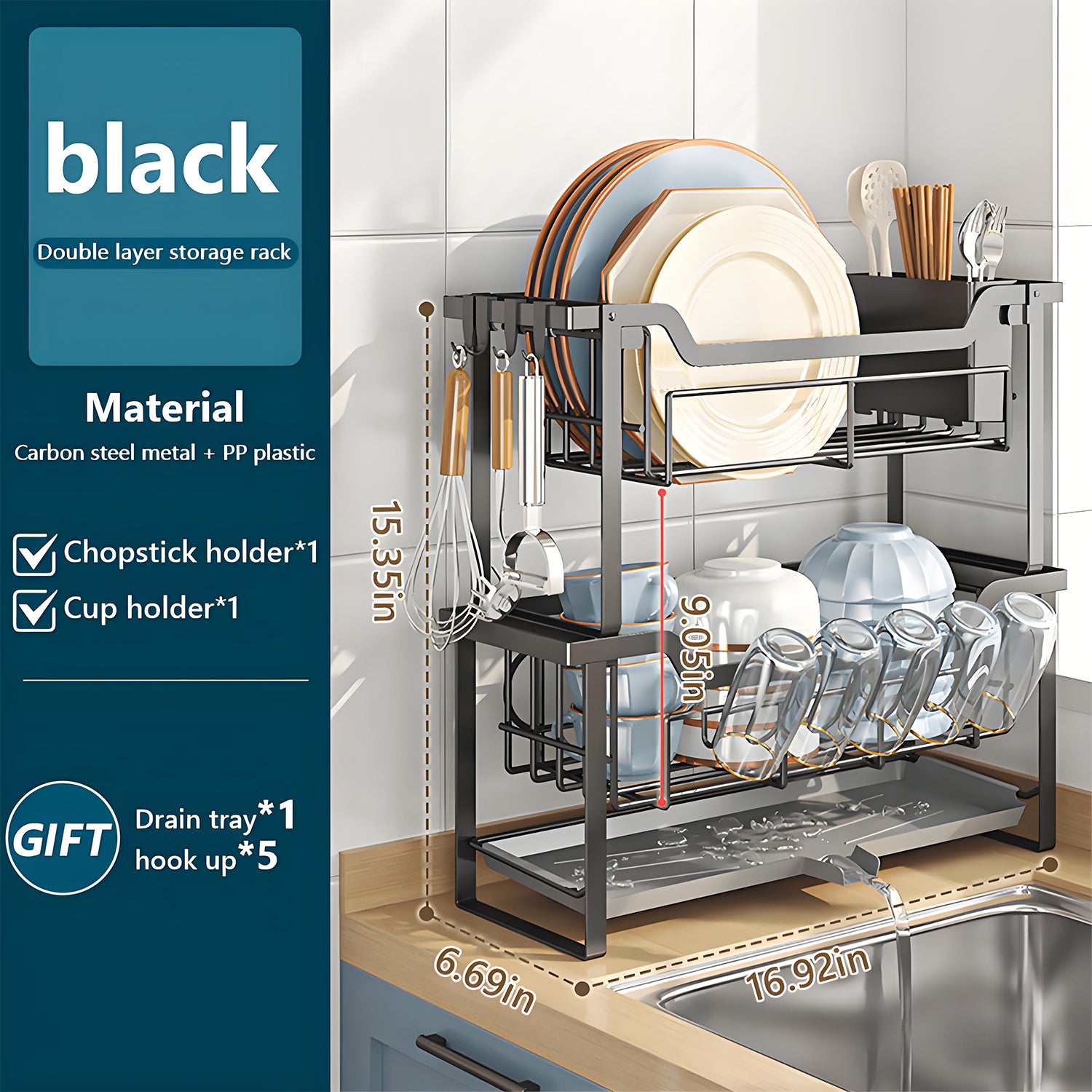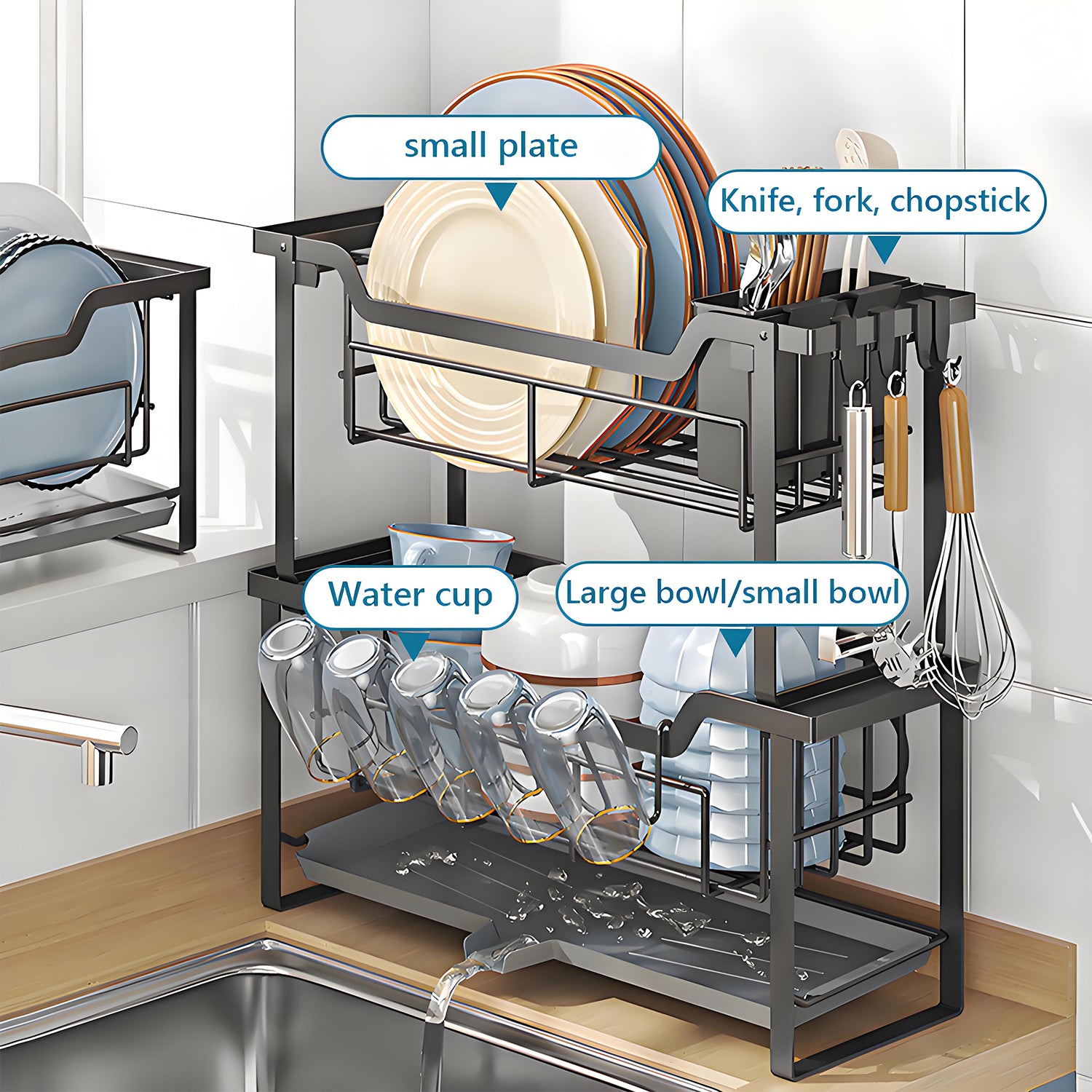 - 【Space-Saving 2-Tier Design】 Features an upper tier with angled slots for secure plate/bowl placement and a lower drip tray for cups/mugs. The vertical stacking design saves 40% more counter space compared to single-tier racks, making it ideal for compact kitchens.