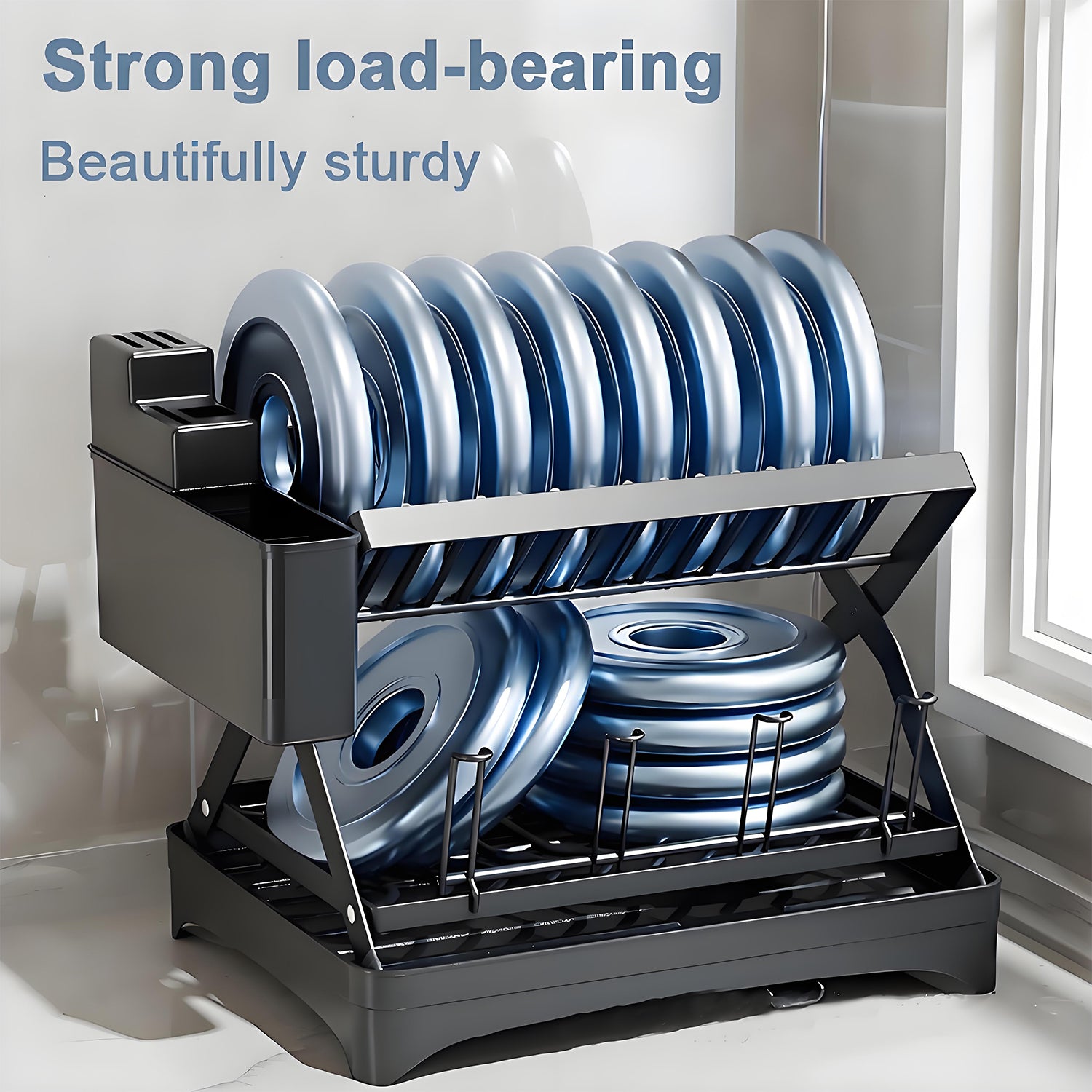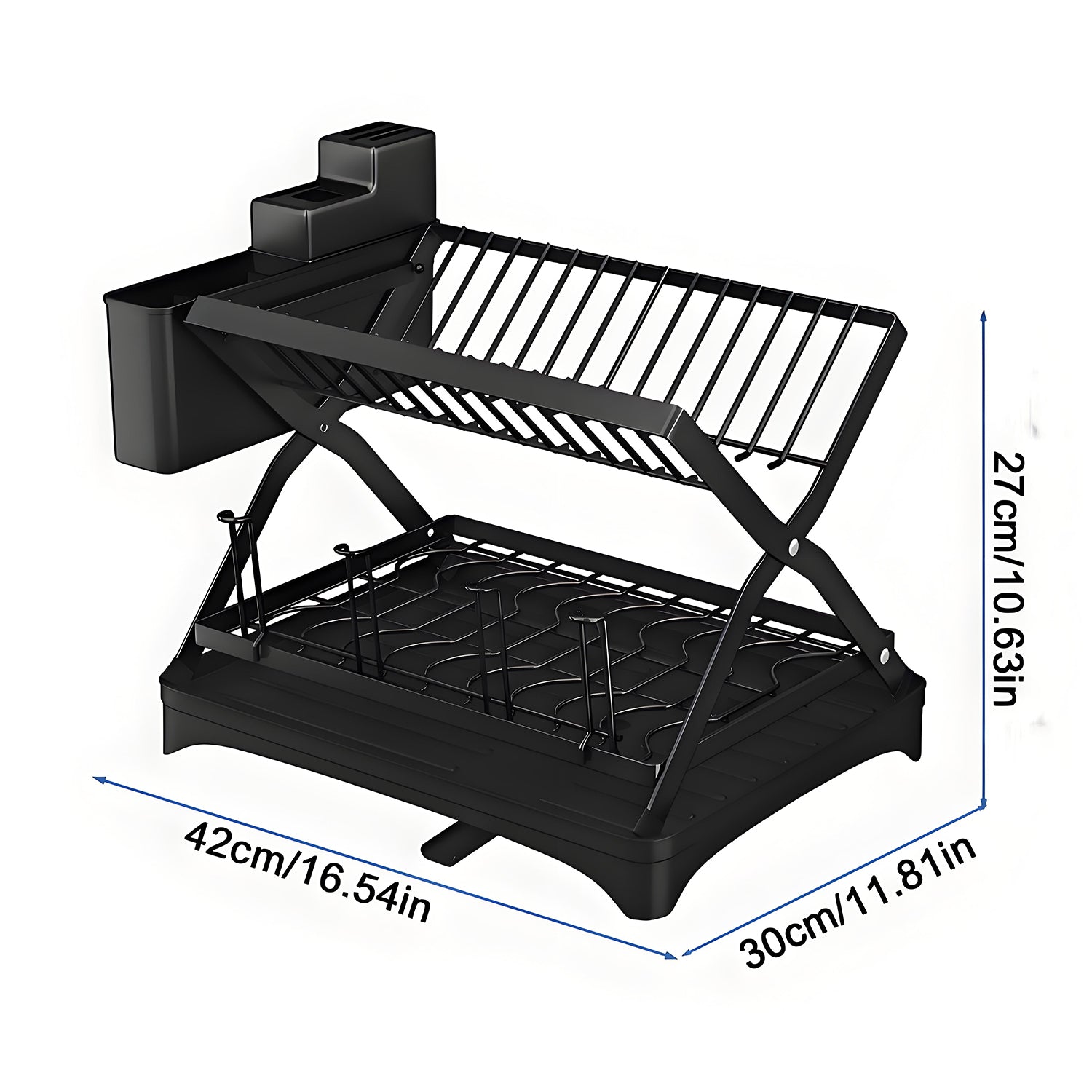 KRKZ 2-Tier X-Shape Dish Rack - Foldable Space-Saving Drainer for Dishes, Cups & Bowls (Black 16.5x11.8x12.2in)
