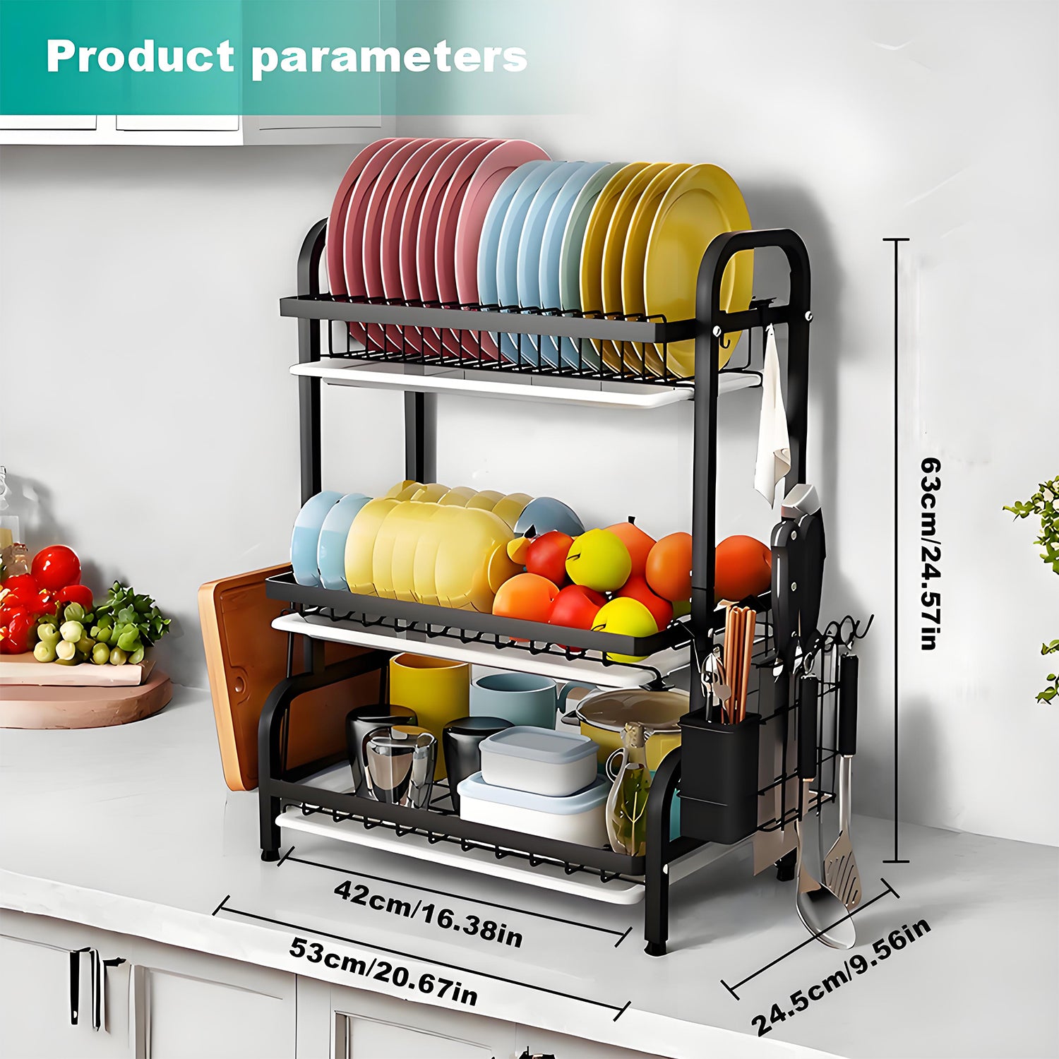 KRKZ 3-Tier Stainless Steel Dish Rack with Utensil Holder & Drain Tray, Space-Saving (Black)