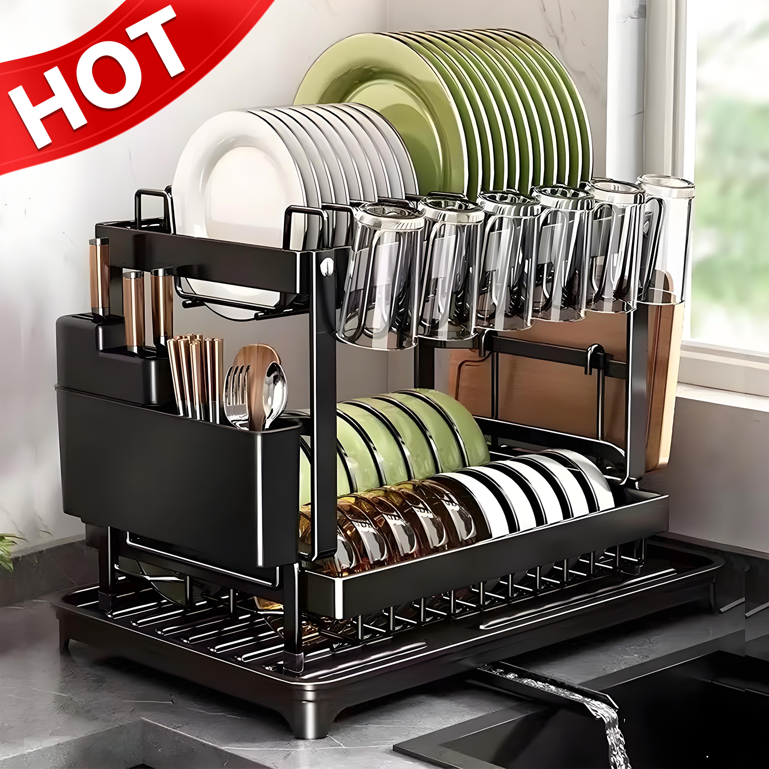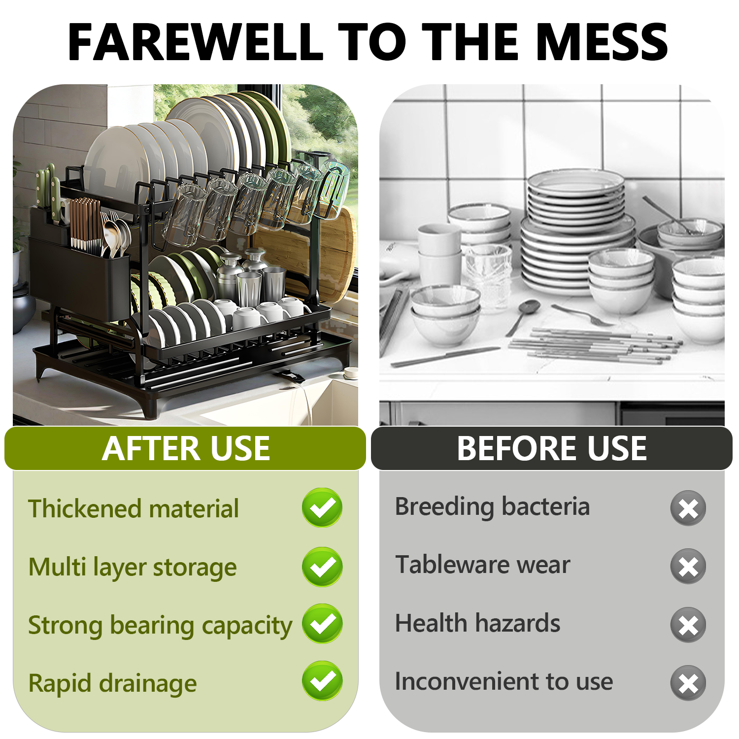 - 【Efficient Draining Design】 The double-layer structure features an upper rack for placing bowls, plates, and cups, while the lower rack is designed for larger dishes or cookware. With multiple draining holes, it ensures rapid water drainage and prevents water accumulation that could lead to bacterial growth.