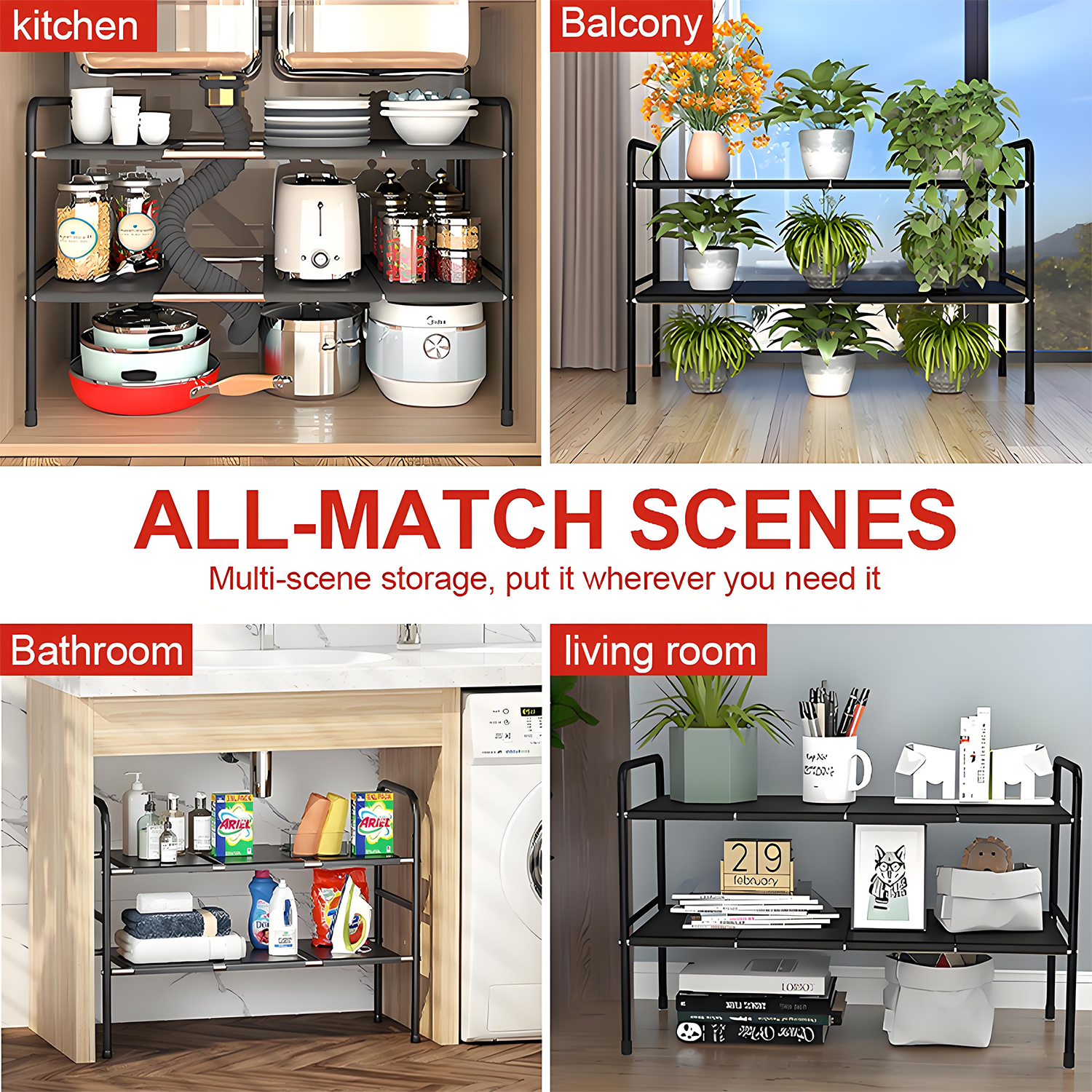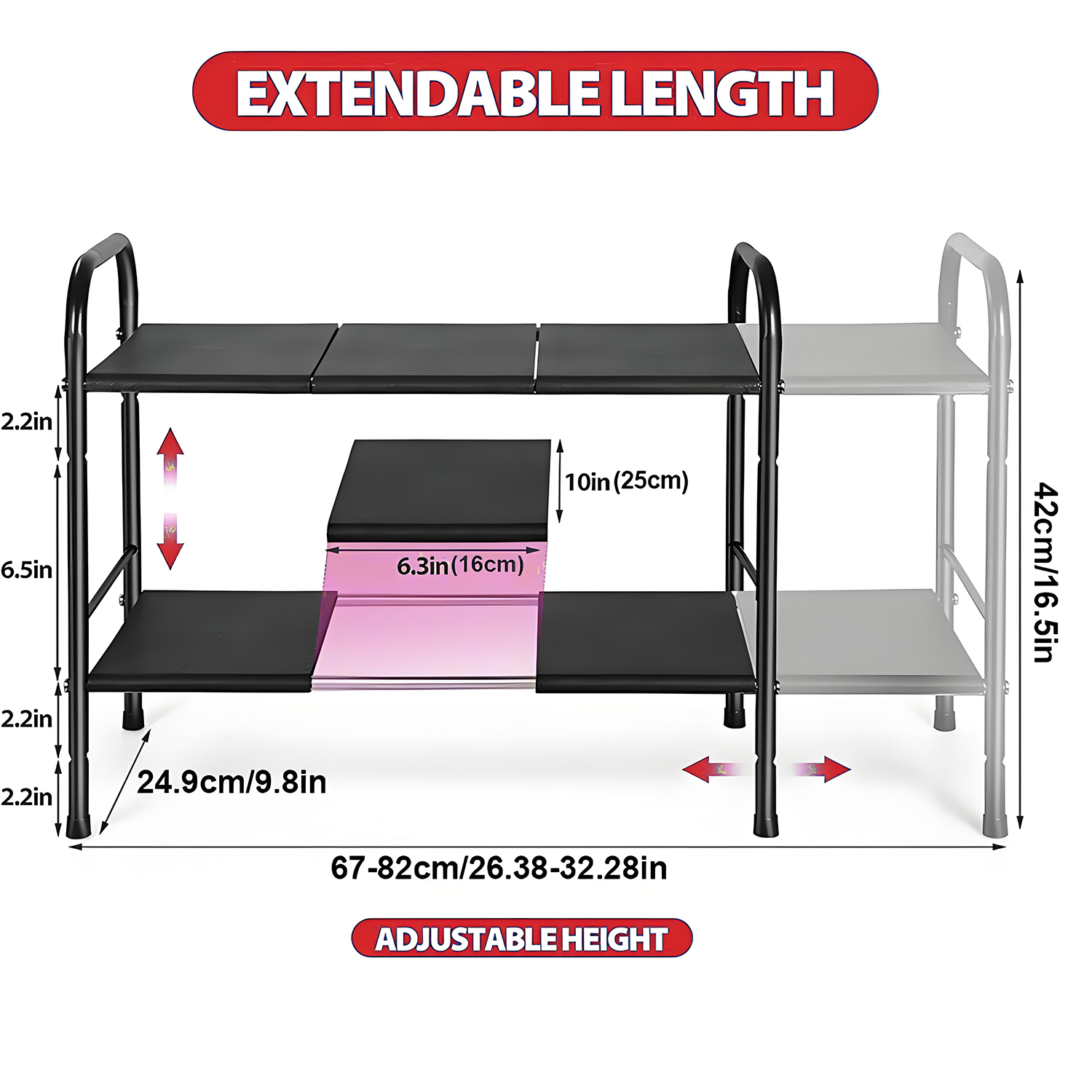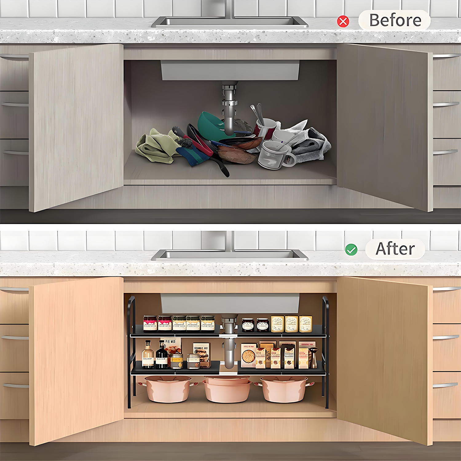 KRKZ Expandable Under-Sink Organizer - 2-Tier Adjustable Storage, Black 26.4"x9.8"x16.5"