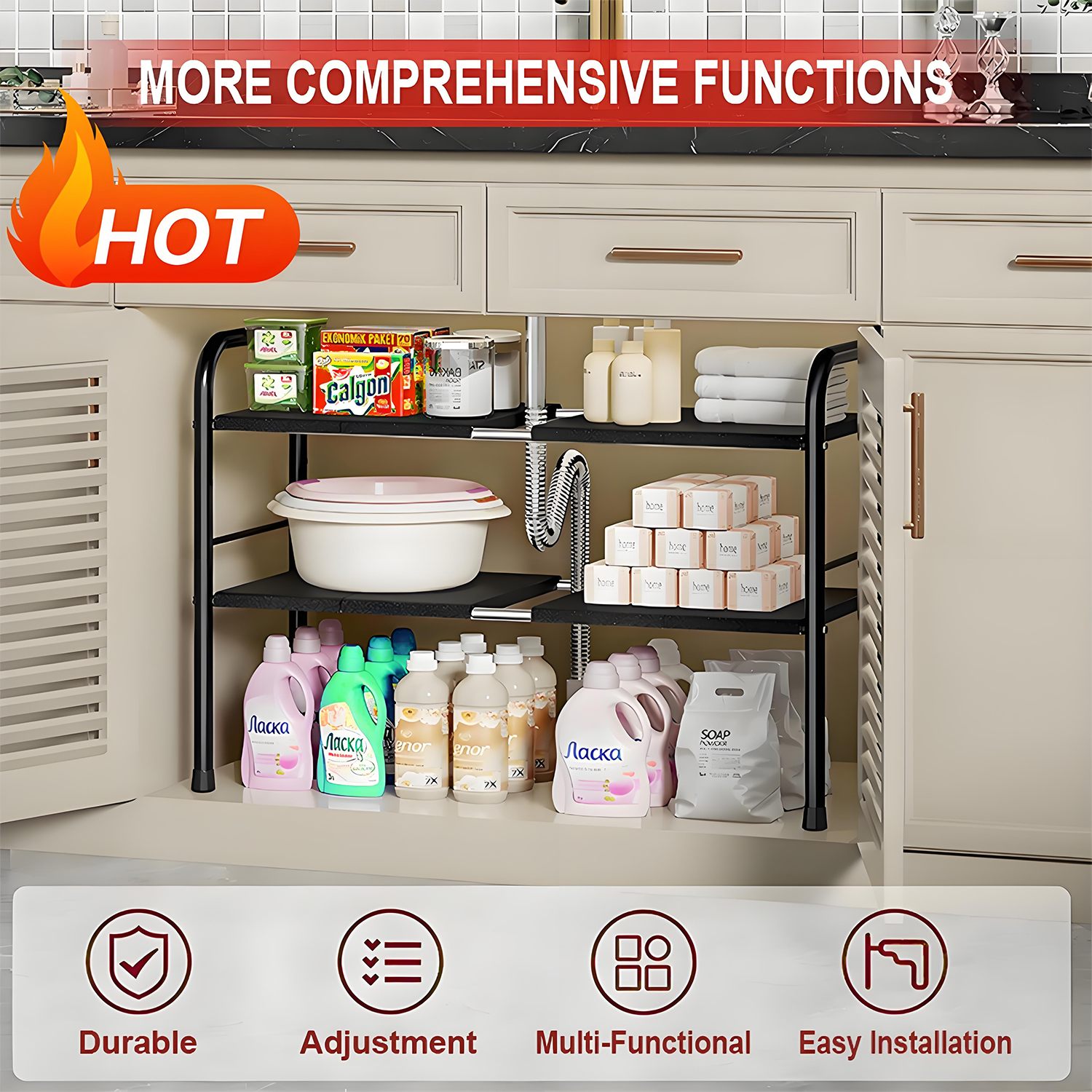 【Customizable Width】Expands from 26.4" to 32.3" to fit different cabinet configurations.