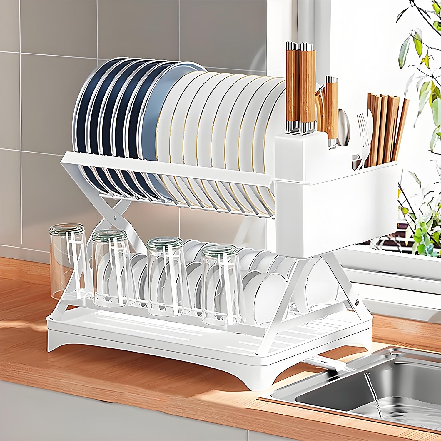 - [Foldable Design] The double-layer X-shaped dish rack features a foldable design—expand it for use and fold it flat when not in use, saving space and making it easy to carry and store.